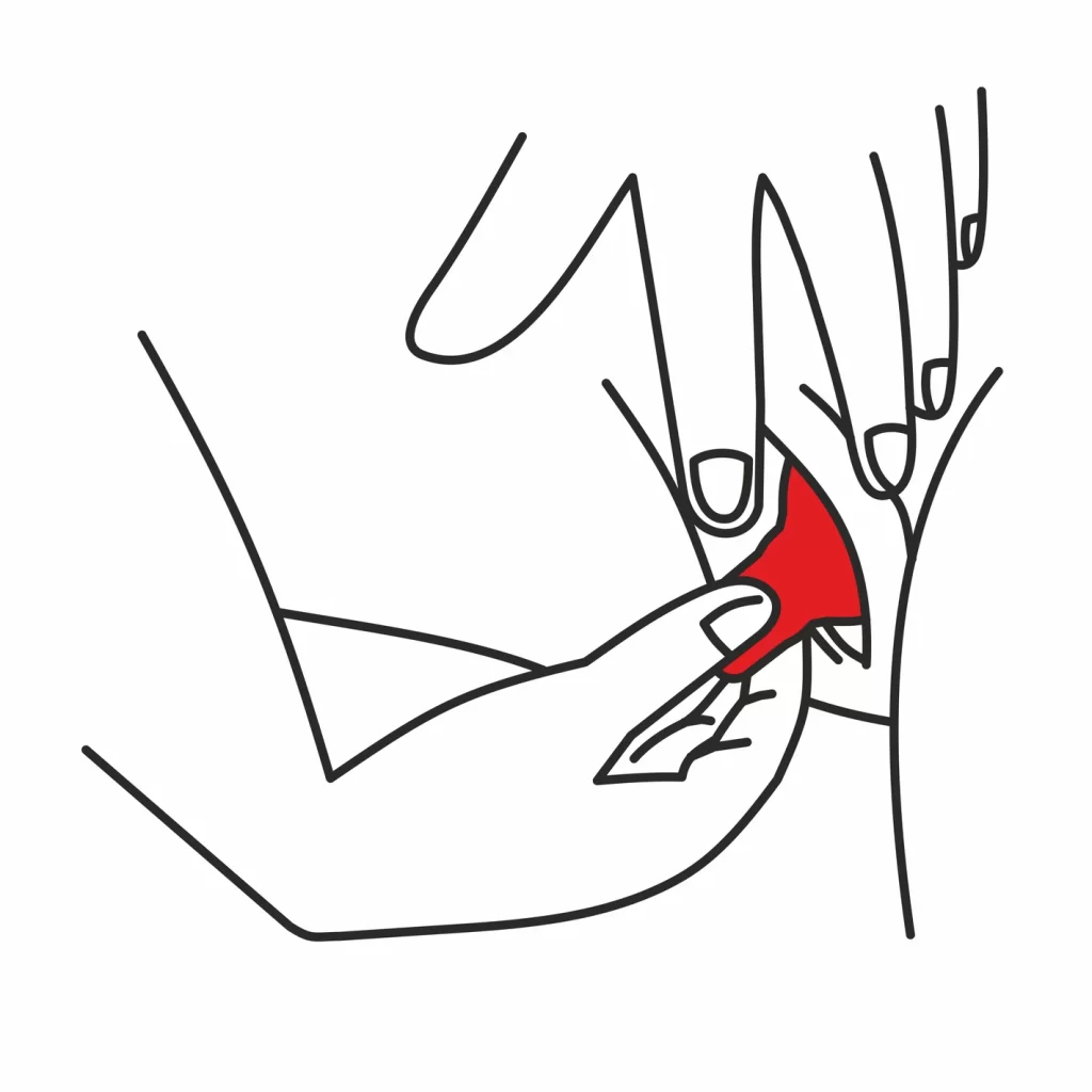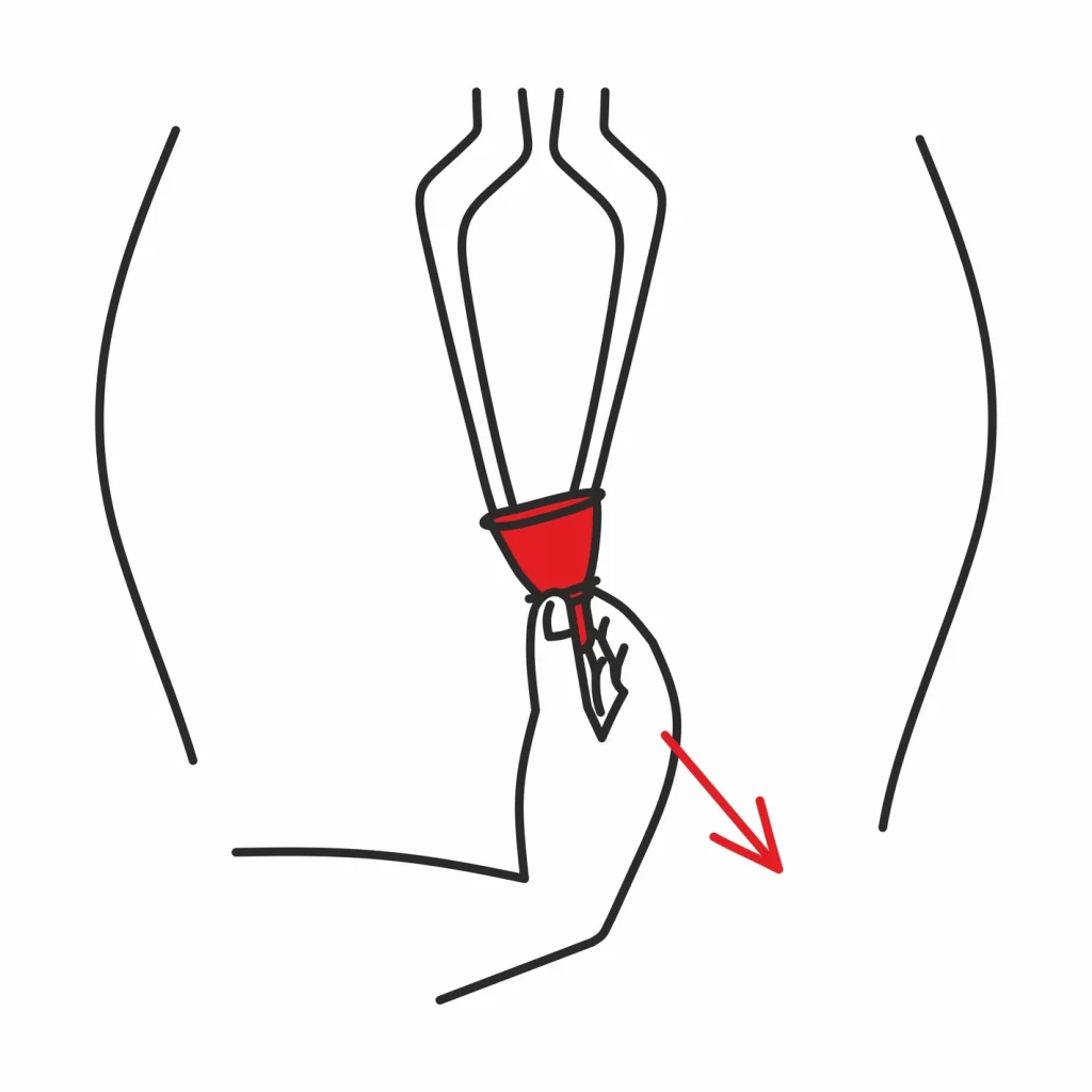 4. After locating the stem, pinch the cup to release the seal with the vaginal wall. You can use the grip rings on the stem to establish a firm grasp. Then, pull directly on the base of the cup to remove it.