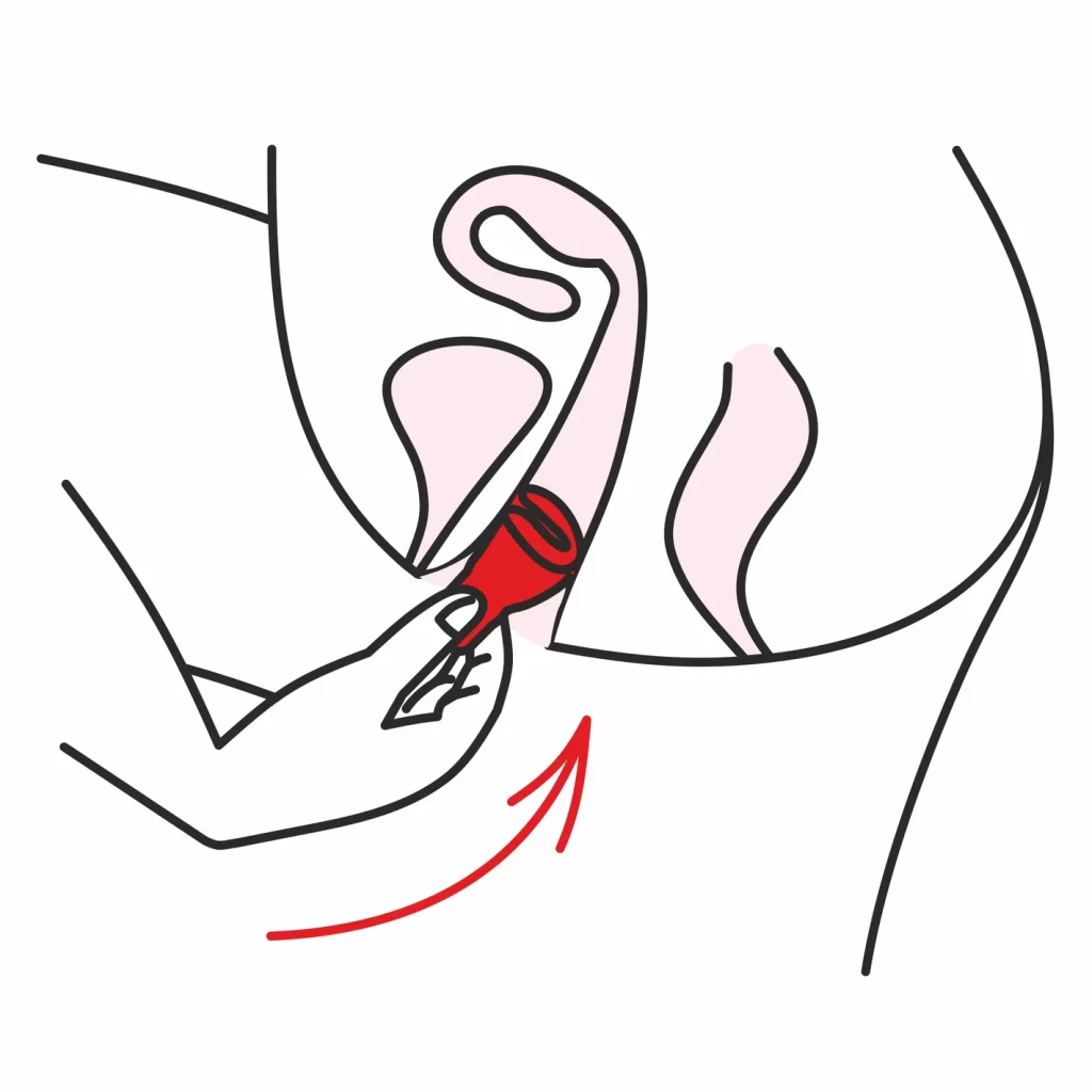 Place your fingers on the rim of the cup, then push down, fold, and hold in place. This method allows easier insertion at a diagonal angle.