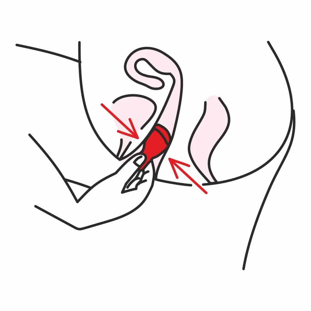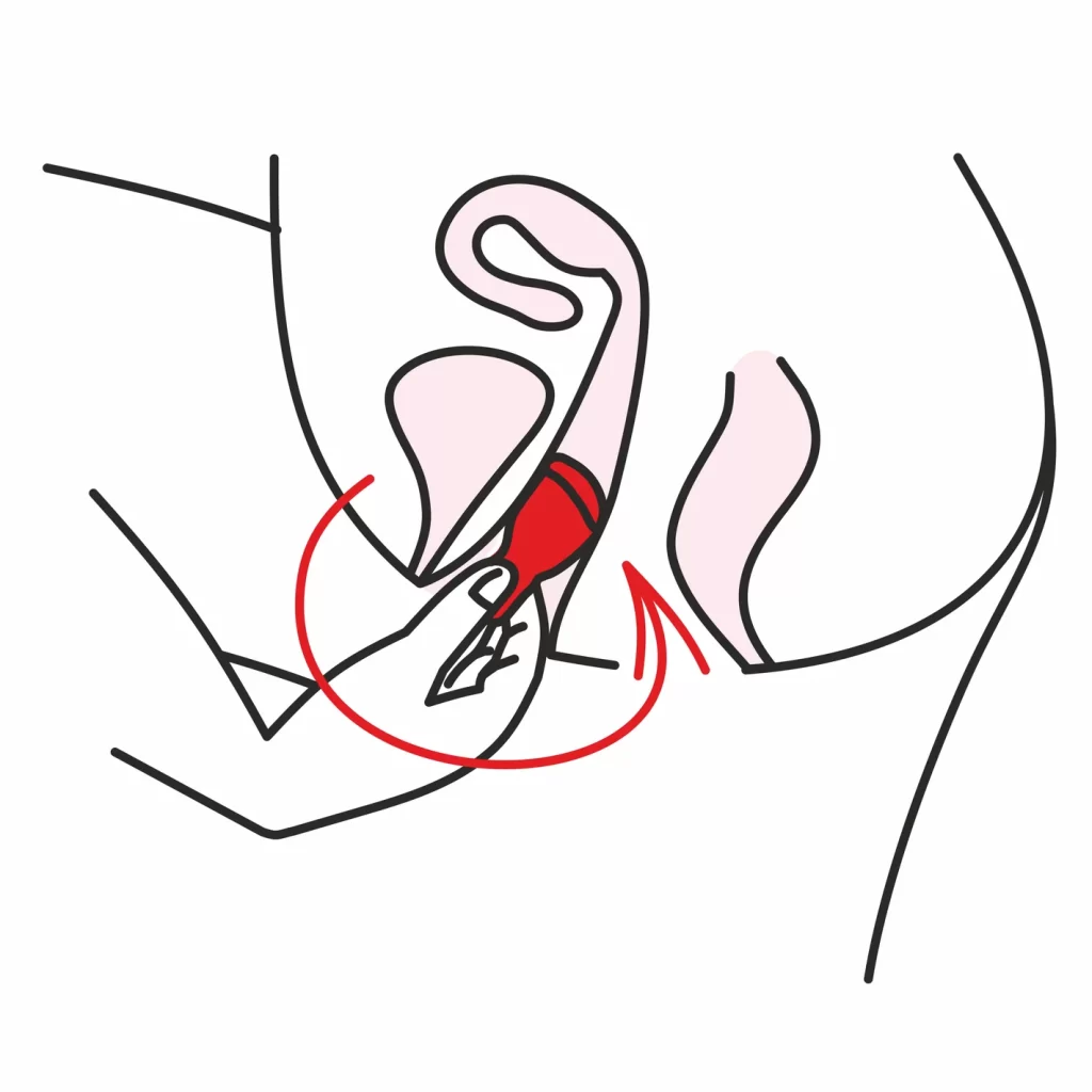 4. Use your fingers to open the vagina. Gently insert the Leia Cup into the vagina, and rotate it slightly to create a seal with the vaginal wall. Then, press down with your pelvic muscles; this action will encourage the cup to open within the body and will further aid in creating a seal